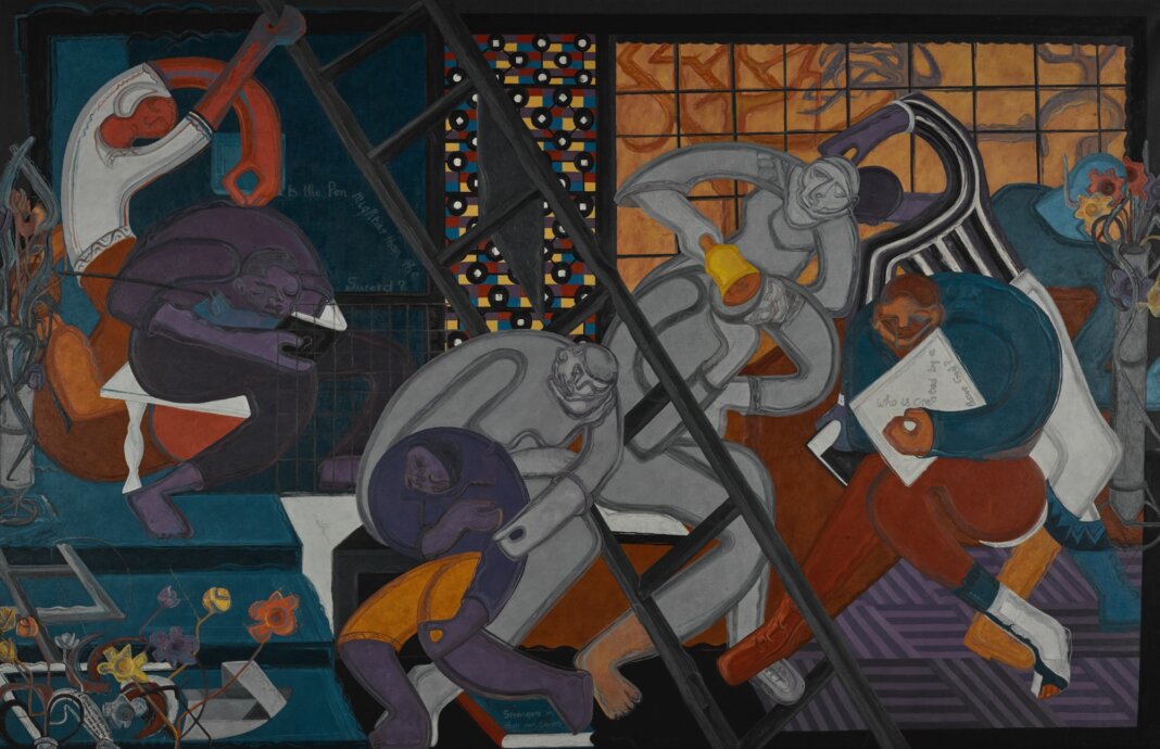 The exhibition concludes with Uzo Egonu, an artist who lived in Britain from the 1940s onward. His Stateless People series (1980s), reunited for the first time in 40 years, depicts musicians, artists, and writers representing Nigeria’s growing global diaspora. It’s a poignant meditation on nationhood, cultural identity, and the tension between national belonging and artistic independence.